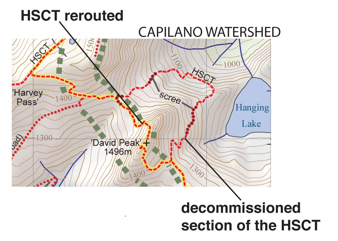 The Howe Sound Crest Trail (HSCT) north of The Lions and south of Magnesia Meadows has been rerouted to go directly over ‘David Peak’ as the primary route. The “horseshoe” section of the trail which drops ~300 m into the Capilano Watershed was decommissioned by BC Parks in late summer 2015. The already existing route that goes directly over ‘David Pk’ has been formalized using BC Parks standard trail markers and is now the official alignment of the HSCT. See revised map image below: